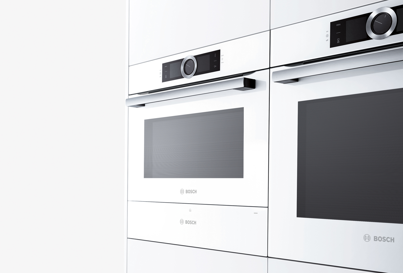 This white, high-quality ColorGlass builtin appliance range has been specially conceived for open kitchens and can be integrated harmoniously in the kitchen environment. Continuous lines facilitate the combination of several appliances. The defining feature of the purist series is the central control ring, by means of which the appliances can be controlled with the fingers. Sensor technology and BoschAssist automation simplify preparation of foods. Besides the integrated steam and microwave functionality, the interconnected appliances offer new possibilities of interaction.