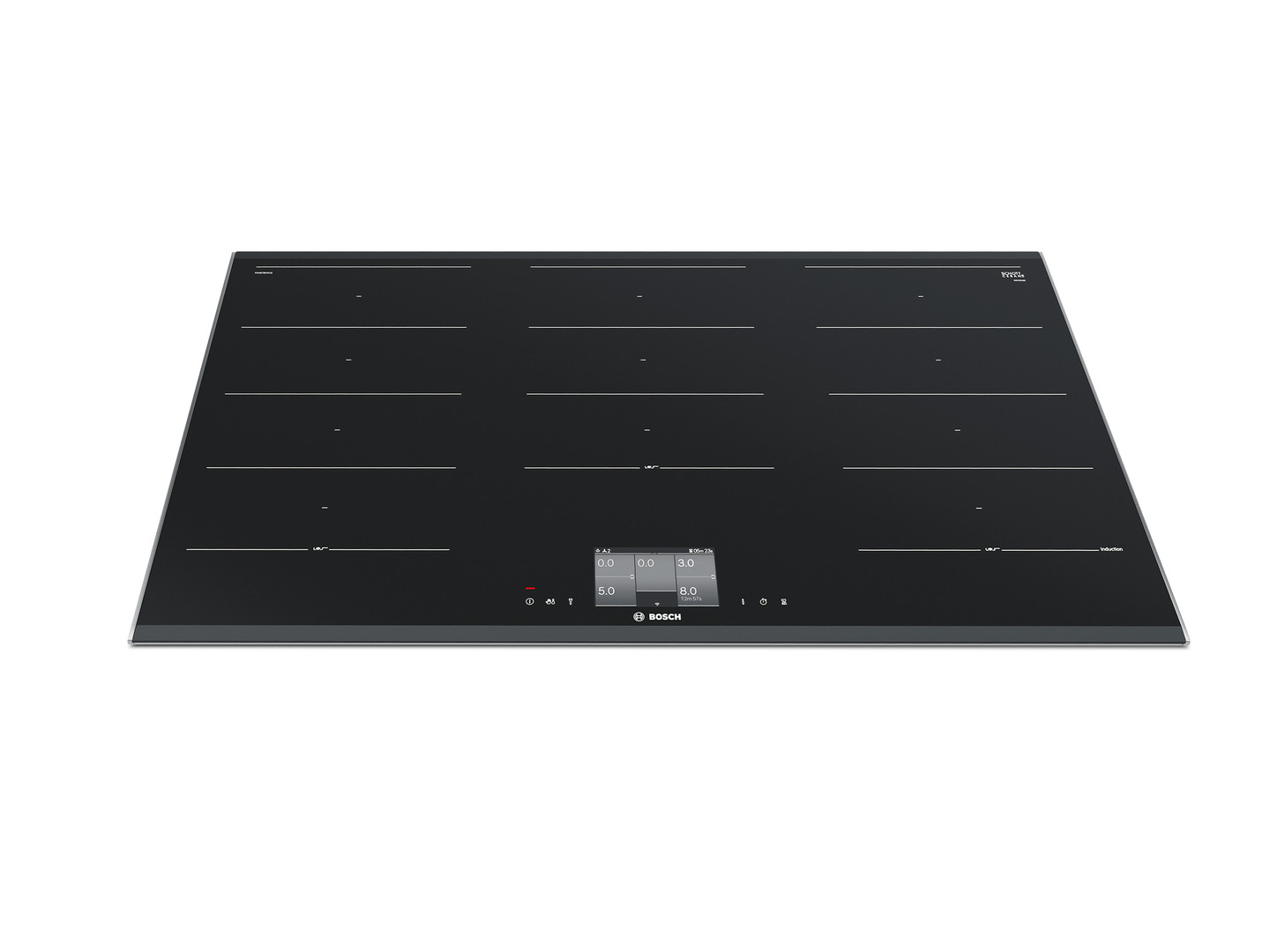The Series 8 TFT-Cooktop is an induction hob with TFT display, offering intuitive menu navigation via touchscreen. By means of the ”Bosch Assist“ function, dishes can be chosen and the corresponding settings made for cooking them. An integrated baking sensor and a mobile cooking sensor assist with checking the results. The cooktop itself consists of glass ceramic and is precisely ground, which, in combination with the flush-mounted metal profiles, enhances edge protection and contributes to the high-quality overall impression.