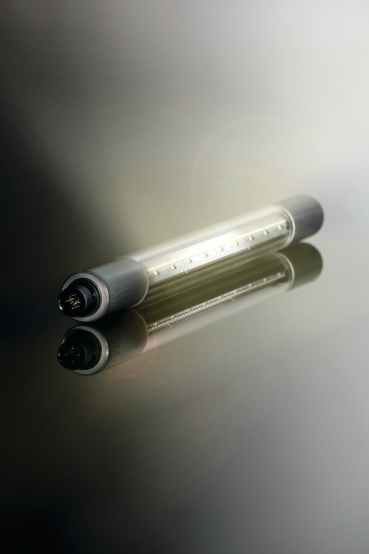 The Series 976 LED light is protected against the infiltration of dust and water, which also makes it suitable for extreme industrial conditions. The high beam angle of 120 degrees enables optimal illumination. Due to its round design, the light is easy to install even in confined spaces. The M12 connector ensures a very high contact quality. The light is available in three different lengths.