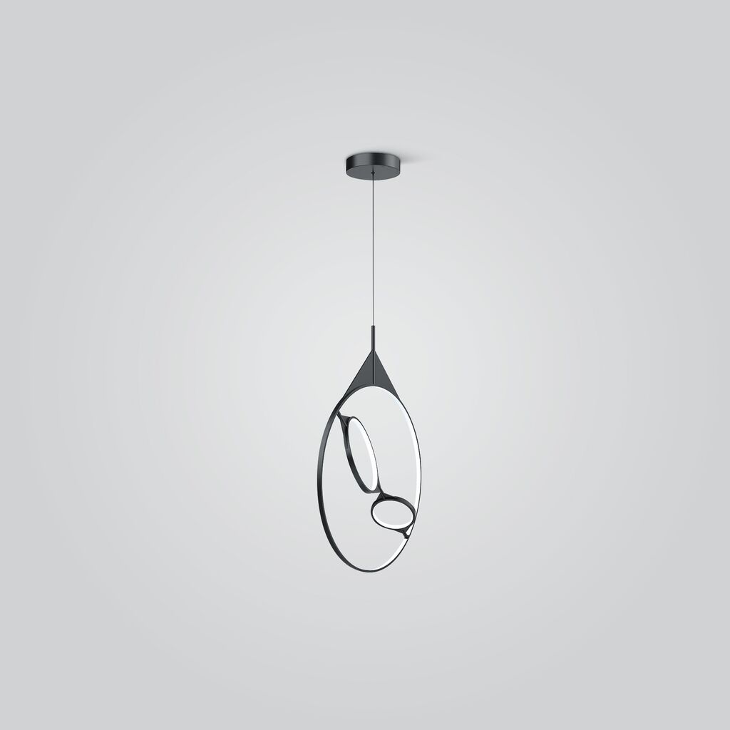 Serif is a sculptural lighting fixture with a spatial presence that changes with the viewing angle. Its circular luminous elements twist around their own axis, turning the circles into ellipses. The design is based on the playful use of geometric elements and connects differently-sized luminous rings with triangular coaxial connections. The minimal silicone diffusers achieve efficient illumination and stand out against the black powder-coated body.