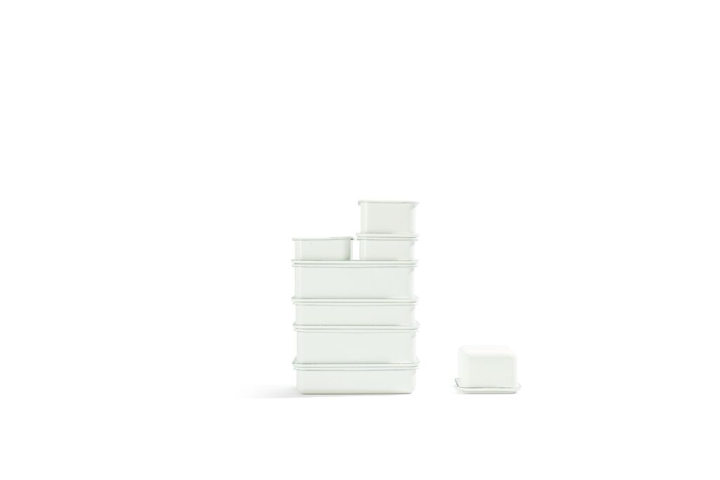 These simply designed storage containers can also be used as serving trays, oven dishes or butter dishes. They can be stacked to save space. When transporting dry goods, the container and lid are held together by a wide rubber band that is kept taut by a wooden ring. Serve + Store is available in four variants, i.e. two sizes with two different heights, as well as in three colours. The non-porous surface of the enamel has an bacterial inhibiting effect and is resistant to fruit acids and alkalis.