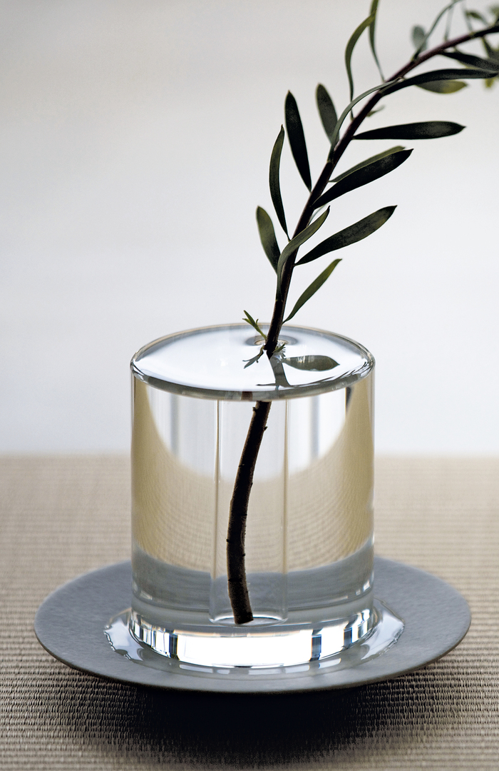 The Shallows crystal vase showcases the surface tension of water. With its cylindrical hole in the centre, it is especially suitable for arranging a single flower or twig. The space between the hole and the outer rim of the vase features a machine-cut recess, so that the vase can be filled with water over the rim. The overflowing water creates the illusion of a water column, within which only the contour of the cylinder is visible.