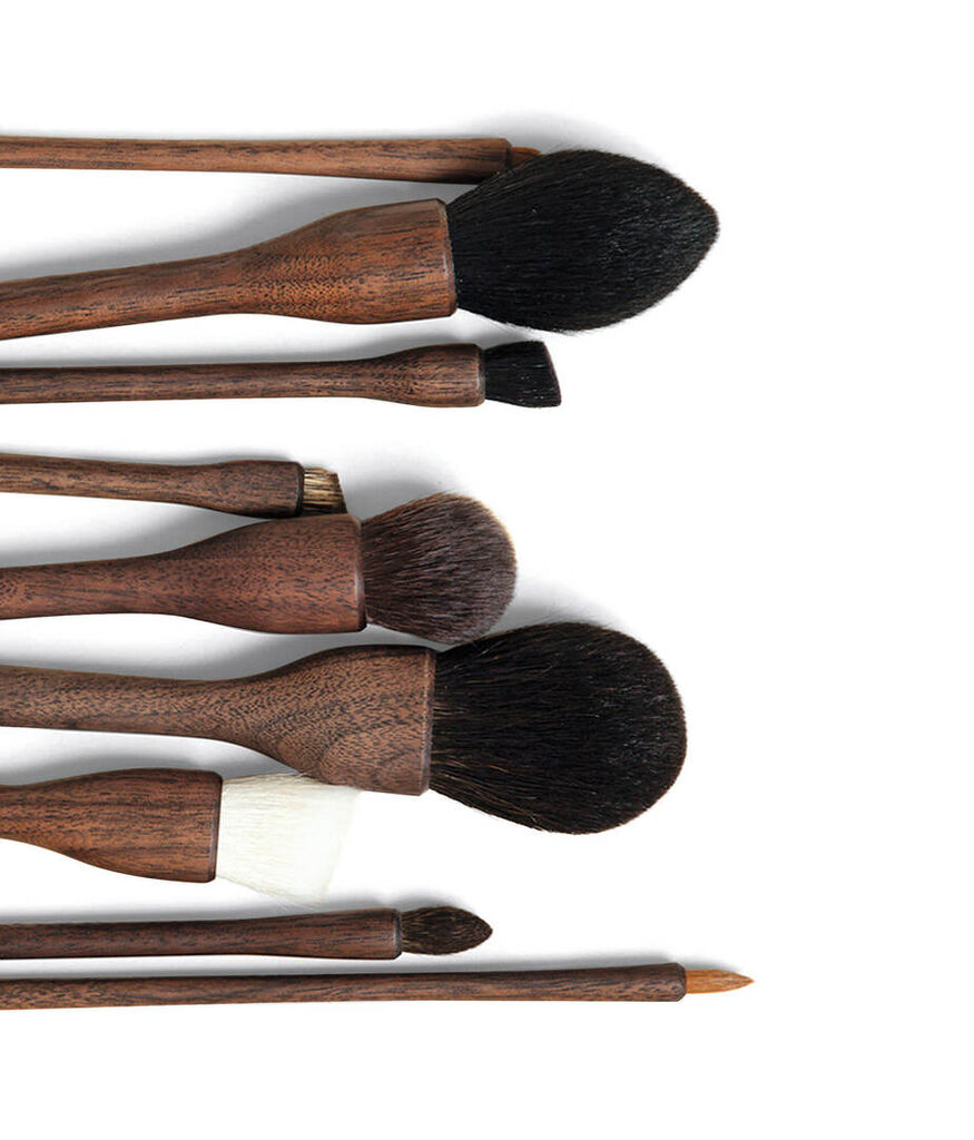 Shaquda “Ubu” is a set of 17 makeup brushes to treat the entire face and specific parts in detail. The hair tips of the brush heads are designed to caress the skin with silky softness. The handles are made of oiled walnut wood; the brushes are applied to them with-out ferrules or any other movable parts. All elements of the set are manufac-tured environmentally friendly.