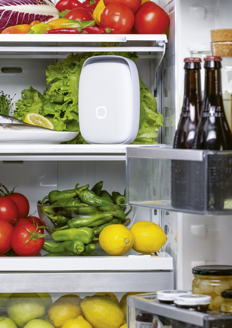 The Shelfy air purifier is a compact appliance that can help to reduce food waste at home. With the help of a photocatalytic filter system, it extends the shelf life of fresh products in the refrigerator by up to twelve days. The technology reduces bacteria as well as odours and slows down ripening processes caused by harmful substances. The appliance is maintenance-free and environmentally friendly. An integrated sensor monitors the opening of the refrigerator door to make you more aware of your energy consumption.