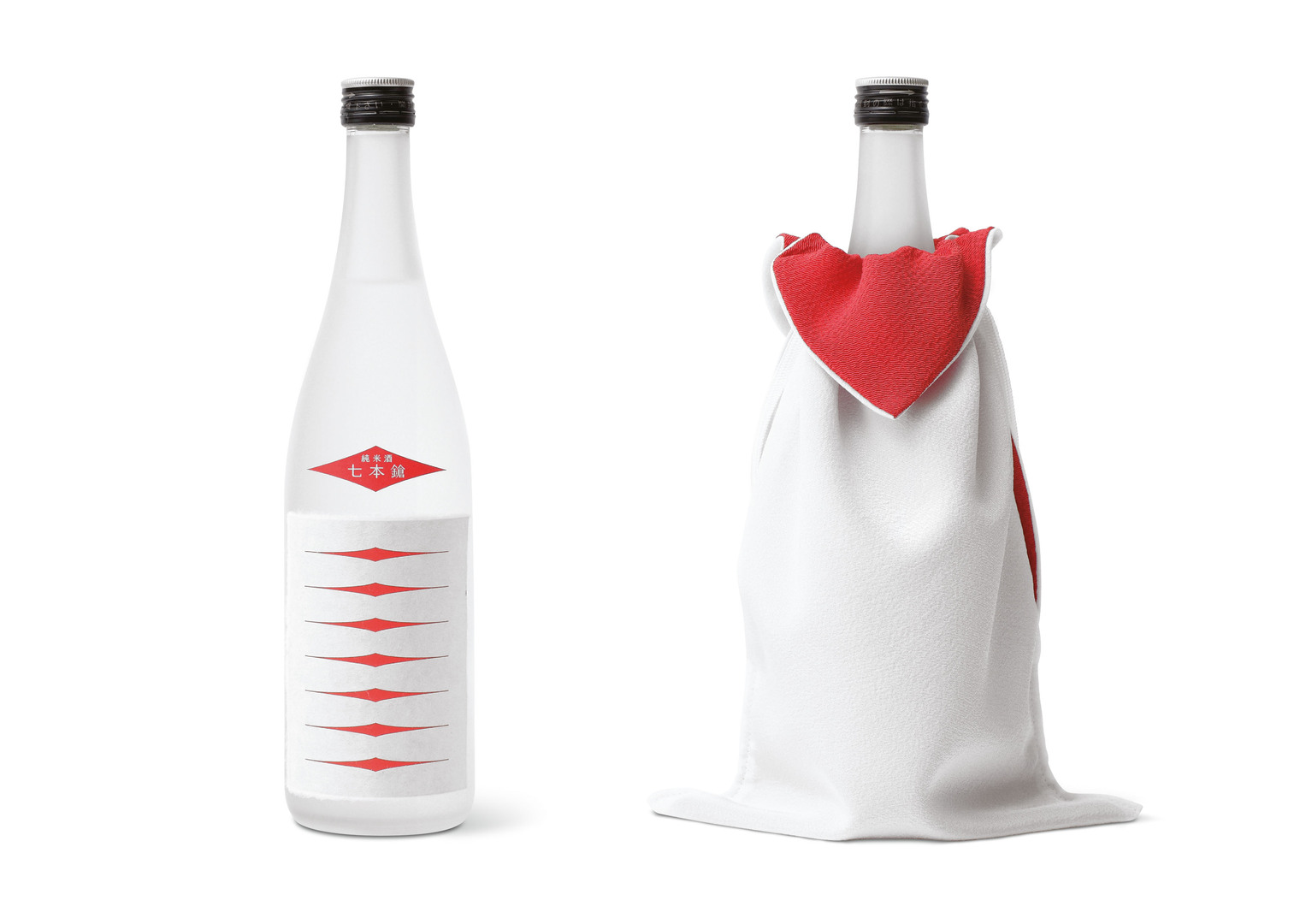 The Japanese sake manufacturer Tomitashuzo has been producing Shichihonyari from rice that is grown in the area for 1,800 years. In order to support local craftsmen and regional industry, the papers and wrapping cloths chosen for the sake bottles were crafted by traditional companies from the region. Both the labels and the textile wrapping play with the colour contrast of red and white. The decorative cloth in particular fosters a high degree of recognition, lending the product an appearance that makes it ideal as a gift.