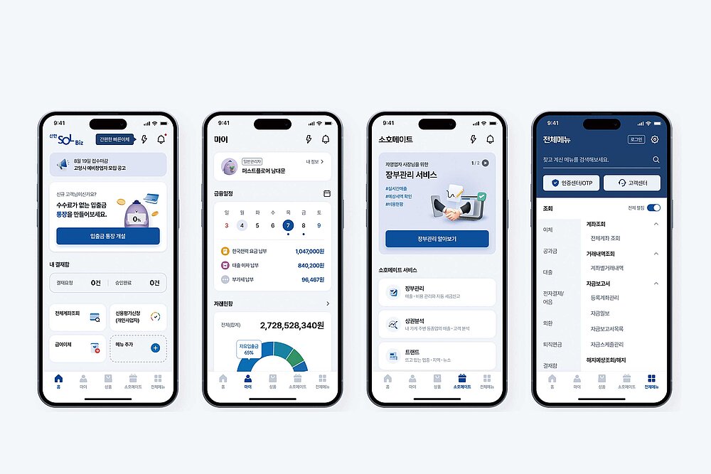 SOL BIZ utilised ‘service design’ methodologies, analysing SME bank usage data to enhance efficiency. Feedback revealed eye fatigue issues among SME owners, leading to the app adopting the high-readability 'Pretendard' font and standardised graphs. Important details are highlighted in 'Shinhan blue'. To improve usability, the app incorporates character designs for long waits and employs consistent design guides.