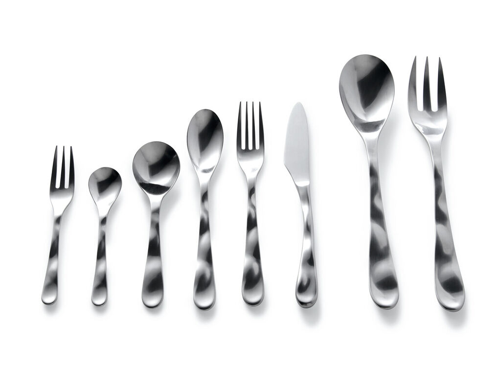 Inspired by water waves, the surface of the eight-piece Shizuku cutlery set features smoothly curved irregularities. Each handle differs from the other handles. The result is an appealing interplay of light and shadow. Recesses furthermore improve the grip and support the fingers when holding the cutlery, which also includes a serving fork and a serving spoon. The manufacturing yields a high level of craftsmanship.