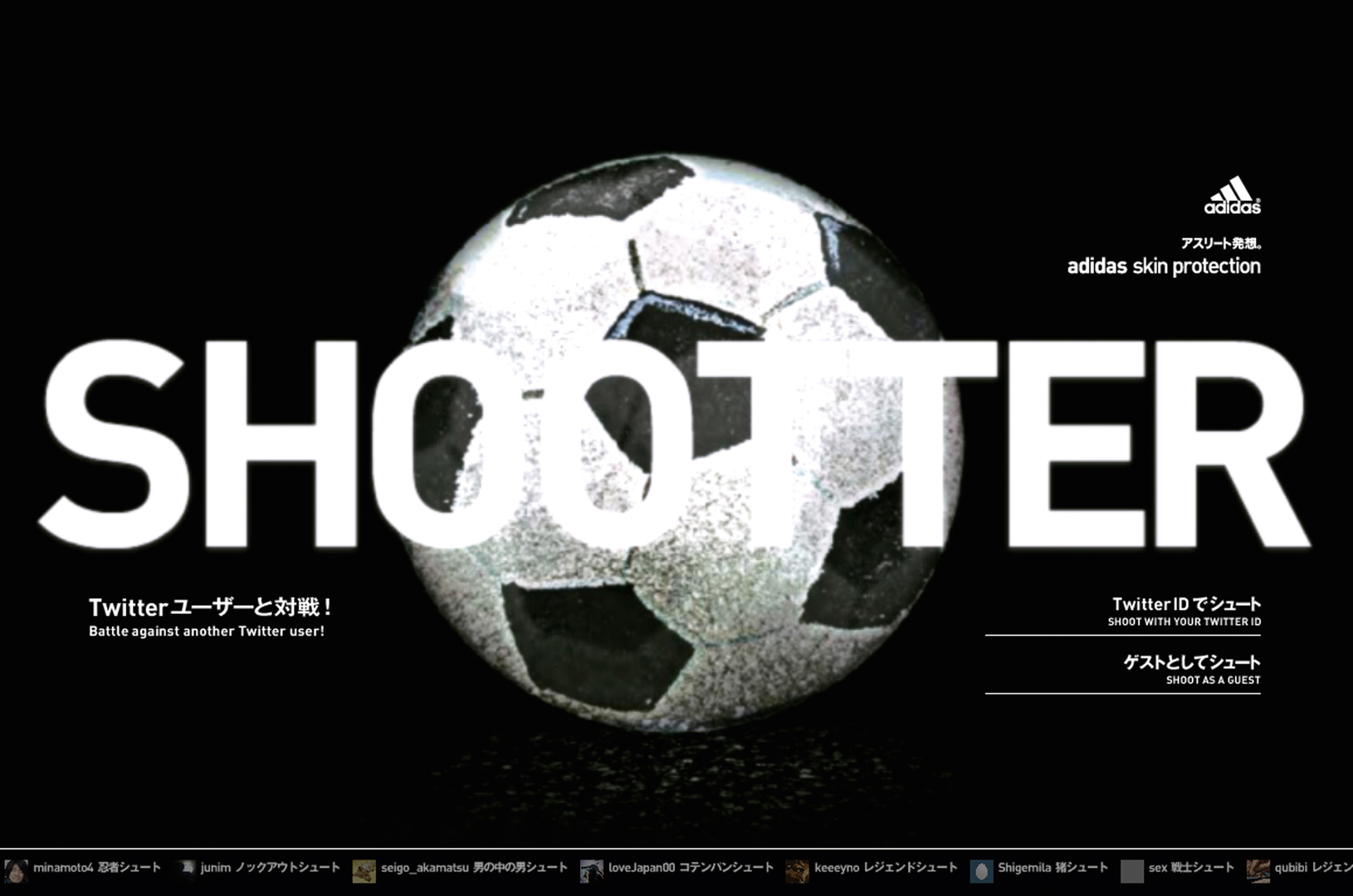 The objective of the “Shootter” campaign was to raise awareness of adidas skincare protection through digital media. It consists of a simple-to-play football game that invites Twitter users to select any other Twitter user as an opponent and to battle for the best shot. The branded content website allows users to play not only against friends, but also against celebrities like Lady Gaga and Christiano Ronaldo. Great care was taken in developing the game visuals in order to deliver an authentic sporting experience.