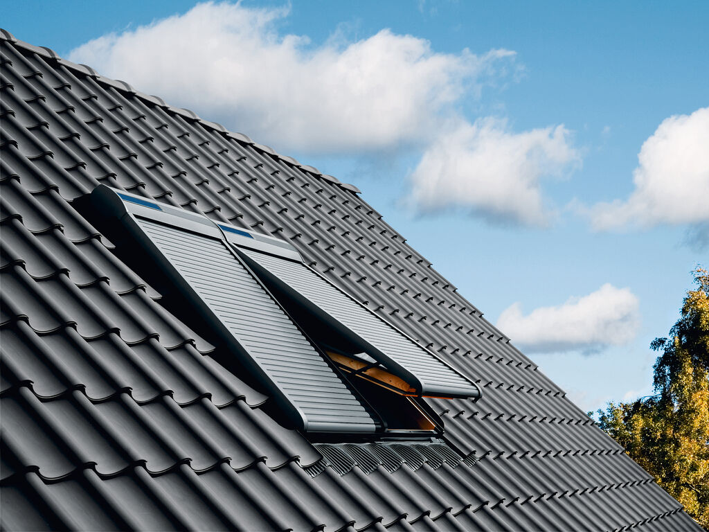 In addition to optimum heat protection and complete blackout, Velux shutters offer thermal insulation. They are made to fit roof windows exactly and can easily be installed from inside. Thanks to their elegant design, which fits flush with the window, they can be integrated harmoniously in any roof. The polyurethane-foam filled aluminium slats not only act as insulation, but also block out sound. The different shutter options allow for opening and shutting with solar power, mains electricity or by manual winding.