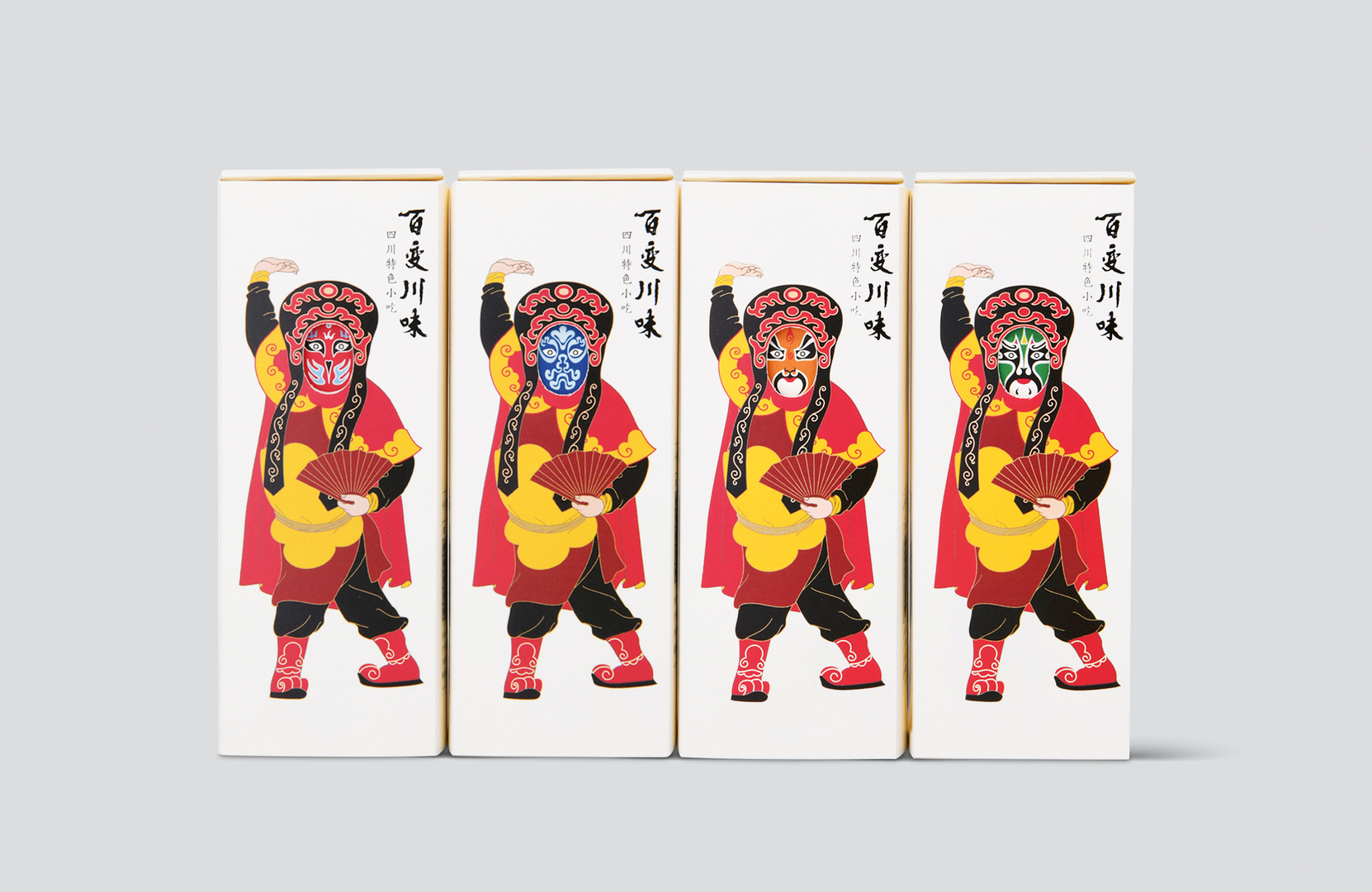 The packaging design for the Sichuan Favor and Flavors snacks, a specialty from Sichuan Province, China, directly links to the famous Sichuan Opera face-changing show (“bian lian” in Chinese), which reflects intangible cultural heritage and is beloved by local people. An essential aspect of these shows is that they always feature unexpected surprises and give rise to a feeling of distinction. Therefore, the design quotes the different faces and figures appearing in the show to give people a welcoming appeal and subtle clues to the various product flavours.