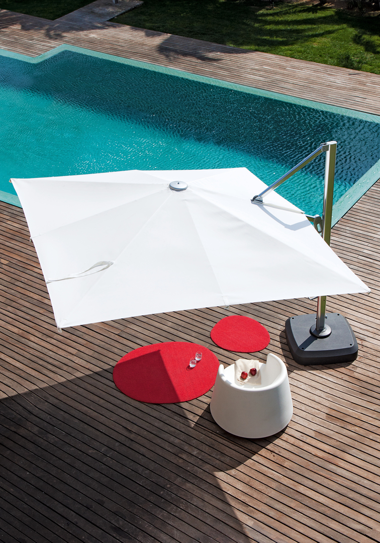 The intuitive to use Sicilia sunshade can easily be rotated by 360 degrees and secured in the desired position. Moreover, the tilt angle of the sunshade can be variably adjusted in one move. The base of the sunshade can be filled with water or sand up to a weight of 140 kg and can be equipped with four castors for easy transport. The distinctive metal frame is protected from oxidation.