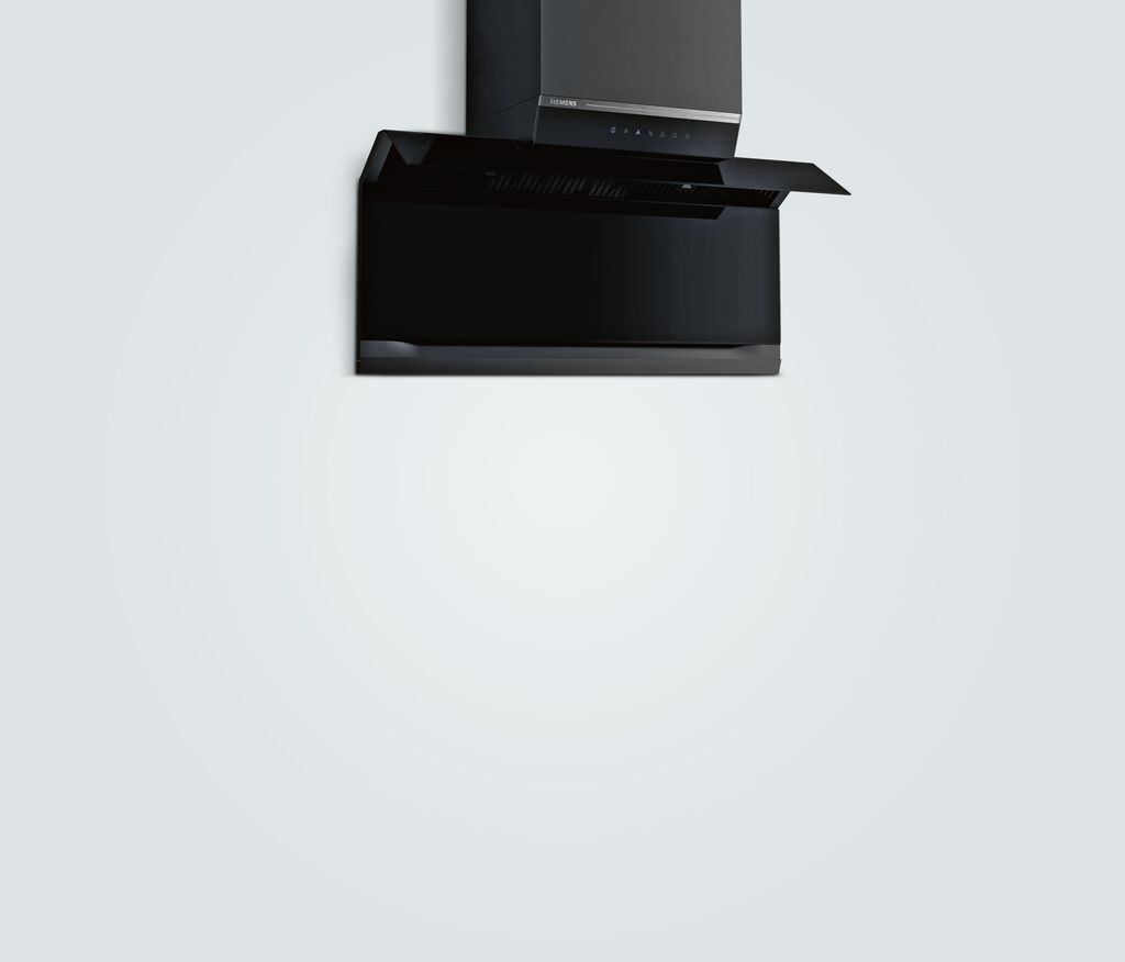Black glass in combination with cast-iron-grey metal lends this cooker hood an interesting appearance. Thanks to angular lines, the SIEMENS Dual Inlet Ventilation also achieves an architectural look. With its compact body, the cooker hood can be installed in open or small kitchens. Furthermore, the control panel, which is inclined towards the user, has been realised in a beautiful way.