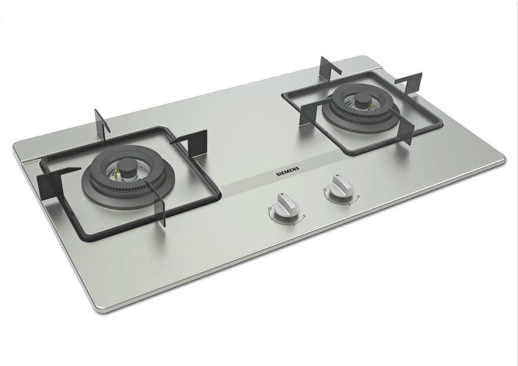 Large stainless steel surfaces give this flat-built gas hob an independent look. The front control board with two simple rotary knobs forms an exciting contrast to the black burners. The low pan and wok supports are interchangeable. Their size corresponds to the central area and creates a symmetrical overall image.