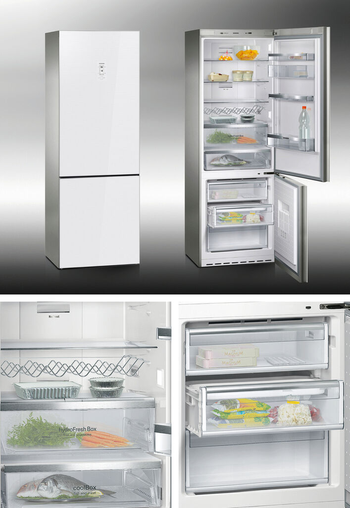 Smooth, white glass door fronts give this extra-wide fridge-freezer a monolithic character. Fully integrated lateral aluminium handles with frameless glass door panels emphasise the deliberately reduced form language of the energy-efficient appliance. Its easy-to-clean touch-sensitive controls have been discreetly integrated in the upper glass door. Glass and precious metal in the interior consistently continue the exterior look. There glare-free LED sidelights provide continuous illumination.
