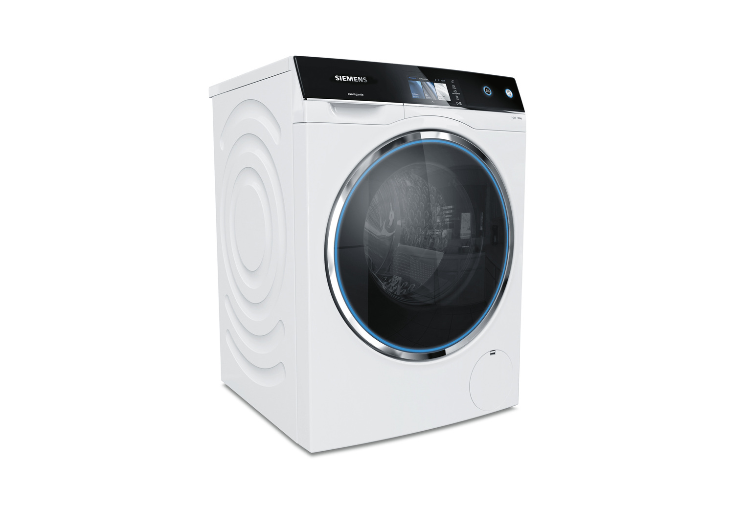 With its blue, illuminated indicator ring, this washing machine hints at the innovative product features on the inside, including an automated dispensing system. A colour TFT display, placed on a bevelled panel, guarantees comfortable handling. The 10 kg washing machine can be controlled from anywhere via a mobile app.