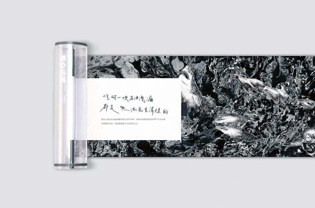Putting a message in a bottle is a very old method of calling for help. The point of this project is that the message comes from the sea itself. Each of the three cylindrical “bottle books” reveals a current threat to the marine environment: oil pollution, rising temperatures and plastic waste. Like a scroll, the paper attached to the cylinder can be unrolled and read from both sides, while the colour scheme reflects the issue in question. In contrast to the detailed illustrations, the cover design attracts attention by means of reduction, focusing on a single meaningful number per object.