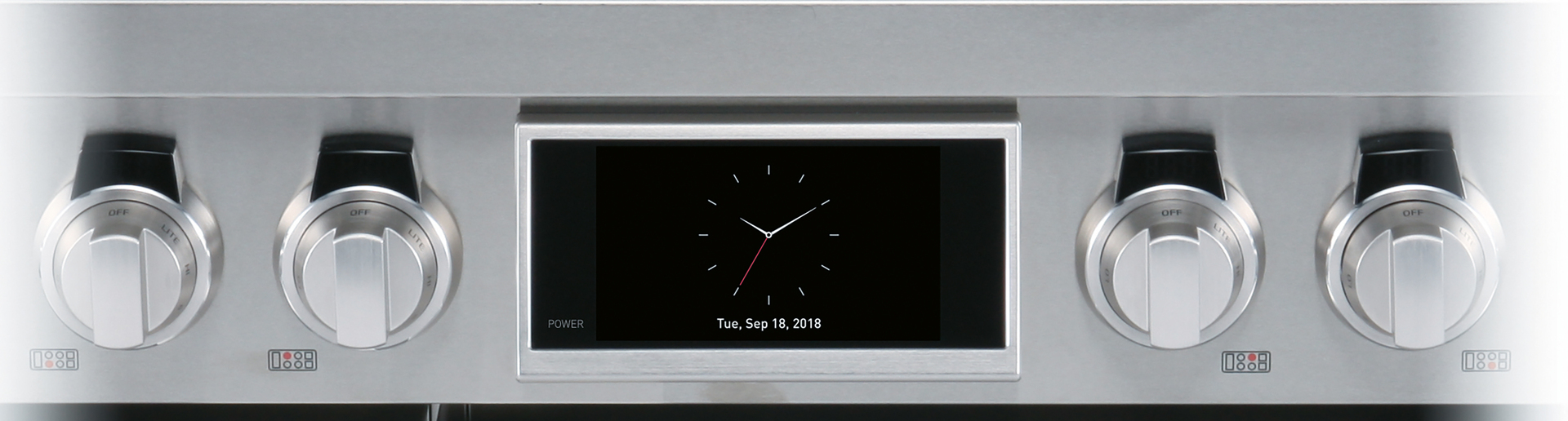 The Signature Kitchen Suite 48” Dual Pro Range is equipped with two different ovens, which are controlled by a 7” LCD touchscreen. The split-screen view allows users to simultaneously control and monitor both ovens, indicating clearly which oven they are currently operating. The black-and-white design matches the look of the ovens and effectively highlights the full-colour images that show gourmet recipes and ingredients, making the cooking experience more enjoyable. In addition, background motion graphics visualise the current cooking status.