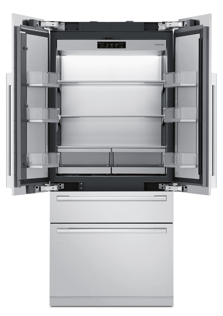 This refrigerator for built-in use is divided into a French door cooling compartment above and freezer drawers in the lower half. Due to the design with hinged double doors, the interior offers a good deal of space. In the refrigerator, aluminium and stainless steel are used. As both the apertures for cold air input and the light sources were concealed, the interior imparts a calm and tidy effect. Cooling compartments and freezer drawers can be easily removed for cleaning.