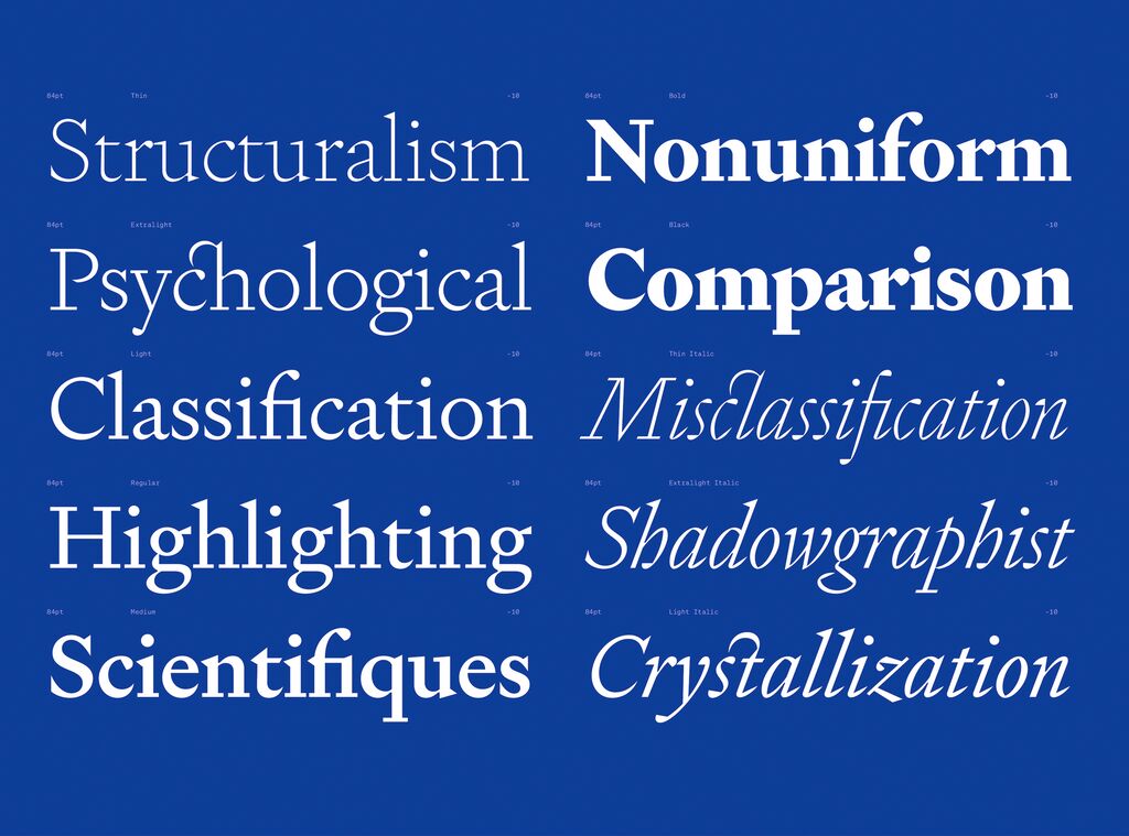 Signifier is a Brutalist response to 17th-century typefaces. Its digital immateriality draws on a deeply material past. Acknowledging the processes and tools of digital form-making, type designer Kris Sowersby worked consciously with the computer to recast the lead, antimony and tin of the 17th-century Fell Types into ones and zeros. Signifier emerged from this alchemy with Bézier curves and sharp vectors determined by machine logic and a Brutalist ethos. Inspired by the realisation that “form is the void and void is the form”, the launch campaign uses a digital version of Yves Klein’s famous International Klein Blue, in reference to his art that dealt with immateriality, emptiness and metaphysics. The typeface is available in seven weights.Statement by the juryThe typeface Signifier perfectly combines the essence of traditional typeface designs from the 17th century, printed in lead type, with the expressiveness of contemporary, digitally created typefaces. The design has succeeded brilliantly in transferring the historical style in its structure of straight lines and finely rounded curves and serifs into the world of ones and zeros in such a way that it has emerged as a new, highly aesthetic and universally applicable interpretation.