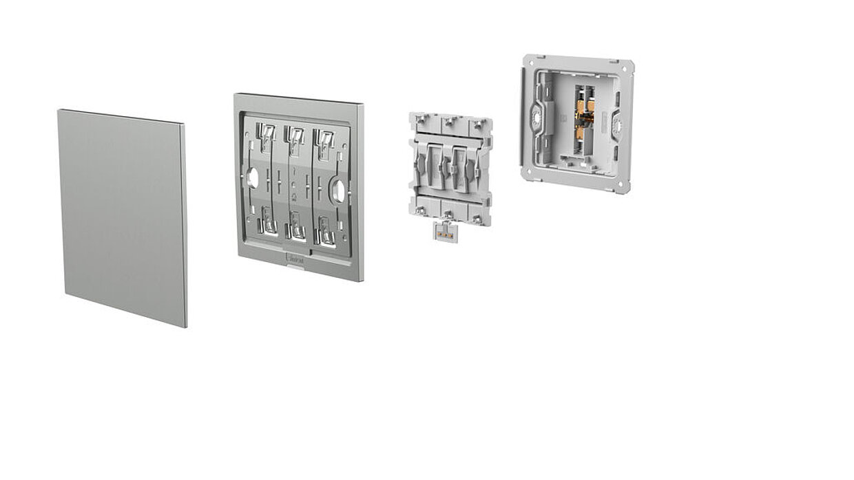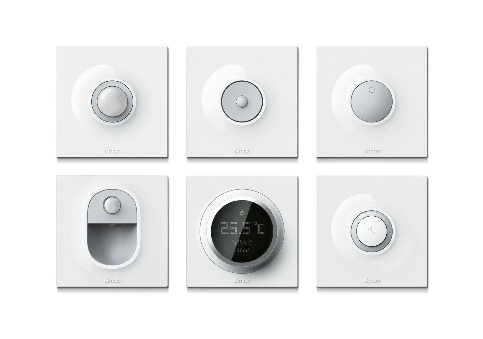 The Simon 50E Electronic range includes the detection and operating controls necessary for a smart home system. The range consists of a time-delay switch, a sound / light sensor switch, a high sensitivity PIR sensor, a ground level light with PIR sensor, a dimmer and an all-in-one thermostat. All the devices are round and are set in a square frame. This gives them a cohesive look. As they are manufactured using some identical construction elements, production costs are kept low.