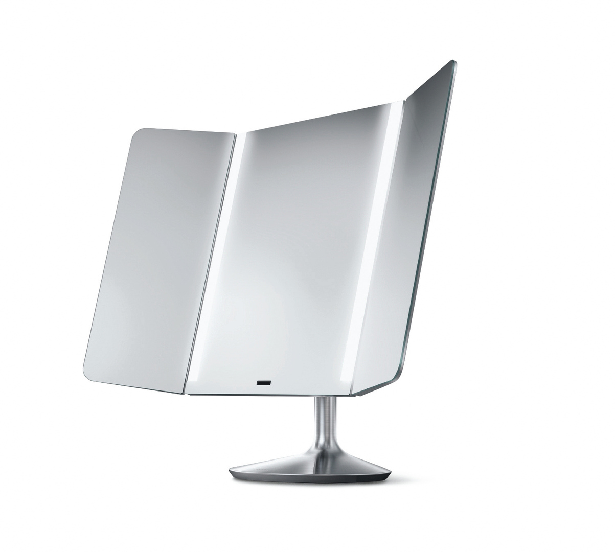 The LED light strips of the Simplehuman Wide-view Sensor Mirror activate automatically as a face approaches. Their illuminance is 600 lux, while the colour-rendering index reaches 90. Through the companion simplehuman app, pre-set lighting settings can be chosen, or ambient light from different locations can be captured to recreate the same colour temperature and intensity in the mirror. Adjustable side panels enable users to view themselves from many angles.
