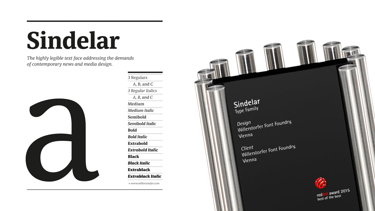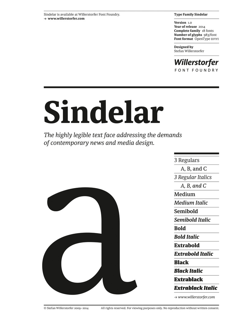 Sindelar has emerged as a well-balanced, powerful typeface that is marked by outstanding legibility and thus satisfies the high demands of contemporary media design. Although optimised particularly for small sizes, its low contrast and robust serifs lend it a strong sense of distinction and an unmistakable appearance, in larger sizes as well.