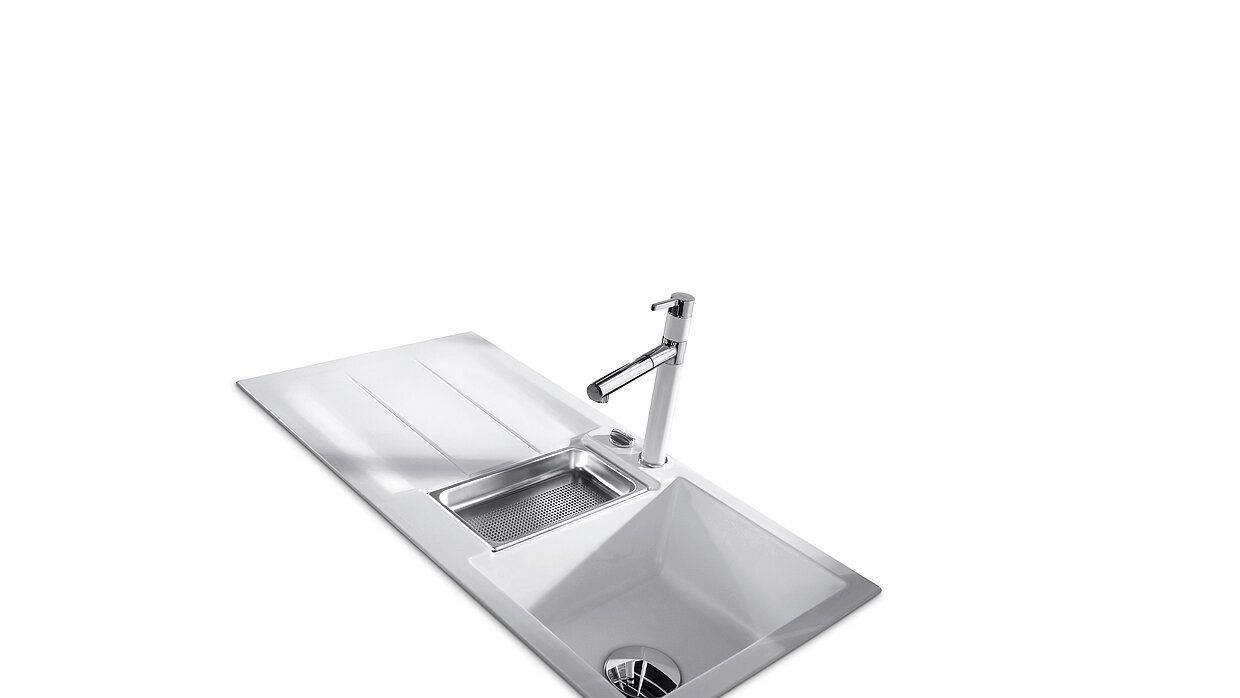The Siro 90 ceramic sink is characterised by sloping surfaces and consistency of form. The tilt of the large, smooth draining surface defines the appearance of the sink. The front and rear rims also slope gently to the basin and draining surface. The tap hole bank located at the side is sloped and holds four possible bores. The sink is thus reversible and suitable for the installation in front of a window.