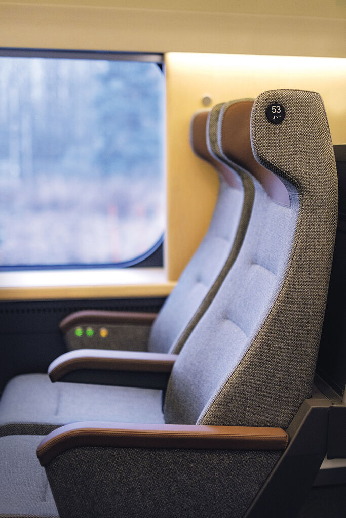 With its perfectly harmonised colours and materials, the interior for the SJ X2000 high-speed train creates a particularly pleasant atmosphere. The elaboration in detail and the lighting concept create a peaceful ambience in the train compartment. The design succeeds in creating the impression of a comfortable interior living space. This is further augmented by the newly developed, ergonomic seats. The interior has emerged as very contemporary for a modern high-speed train.