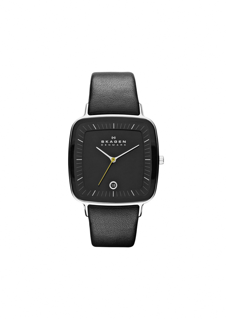 This striking timepiece combines elegant and simple design with precise functionality. It features a distinctive square case with radiused edges. The white and yellow hands against the shiny black dial set modern accents. A soft, high-quality Italian leather strap elegantly complements the timepiece.