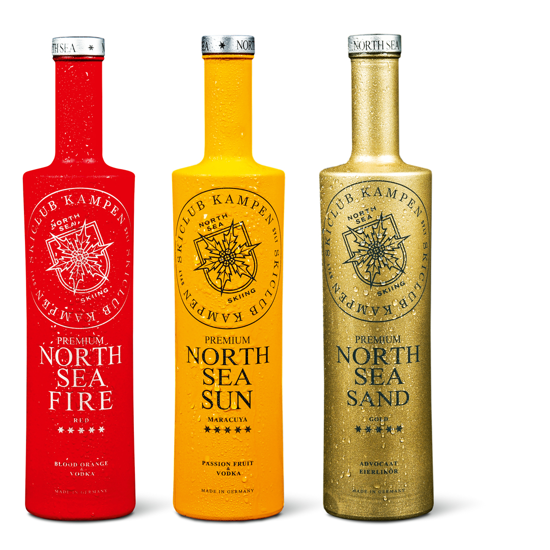 The design of the Skiclub Kampen vodka bottles is inspired by the pureness and freshness of the North Sea, as well as by the smooth shapes of the Wadden Sea, which is a UNESCO World Heritage site. The logo visualises the sea holly, a flower only existing in the particular area of Kampen on the island of Sylt. A monocoloured, organic surface coating lends the bottle a pleasantly soft feel and makes condensed water bead off like on a lotus flower. Each of the six different vodka flavours is defined by a specific colour, while the shade and content of the four mixed drinks are identical to the colour of the bottle.