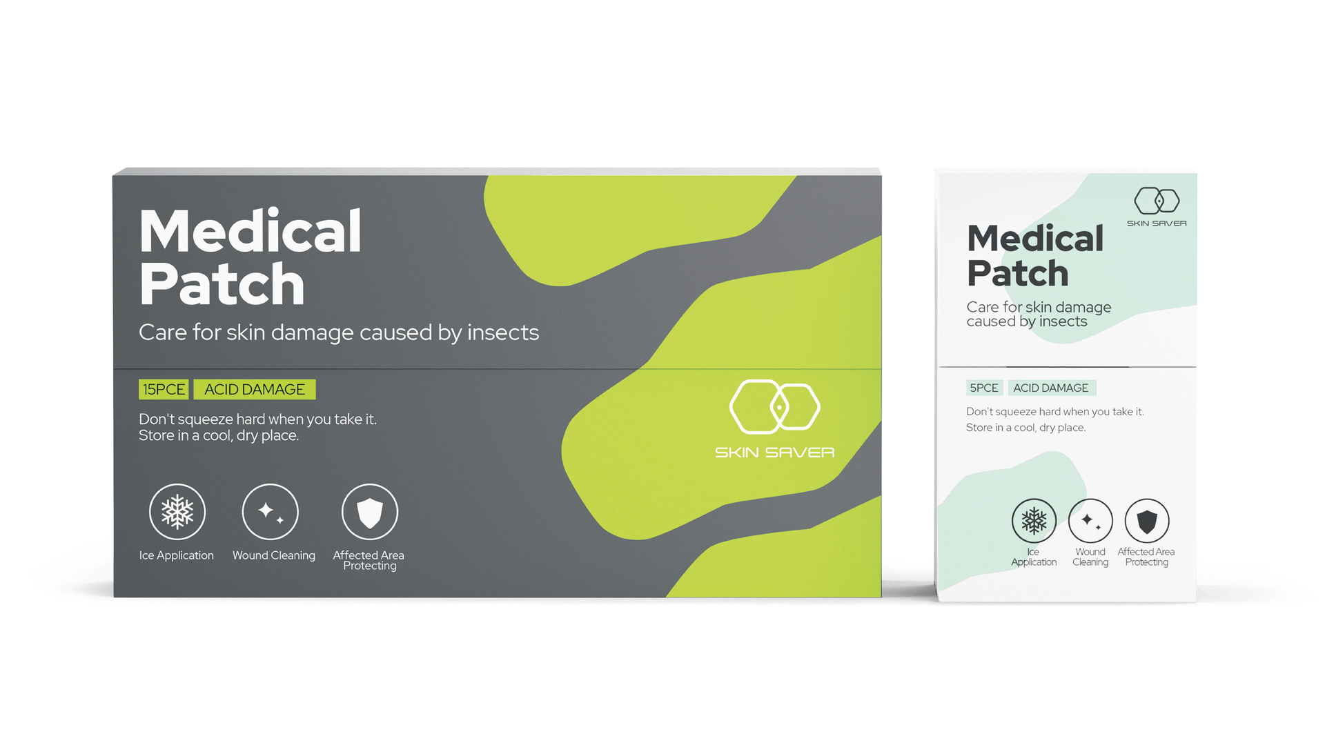 The SKIN SAVER plaster is intended for people who work outdoors and are exposed to a high risk of insect bites. The product integrates the functions of wound cleaning, wound protection and cooling the affected area. In terms of packaging design, a hexagon was chosen as the core element. The geometric shape serves as a logo but is also used as a graphic motif with a dynamically flowing appeal. With simple means, the design thus echoes the edgy contours of the medical plaster and, at the same time, hints at the relief the product will bring to the user.