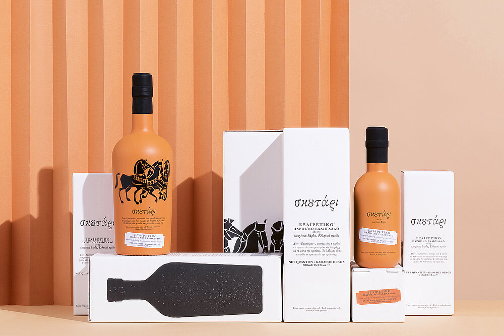 The word “skoutari” means “shield” and is borrowed from the lyrics of the Greek poem “Erotokritos”. In the poem, it protects the protagonist in a jousting tournament. This works as a metaphor for the way in which the olive oil protects the human body thanks to its ingredients. The jousting scene is depicted using three horses. Inspired by the ceramics of ancient Greece, linocut printing was used for the design. The bottle is coloured brown to mimic the idea of ceramics. The typography is inspired by an early Greek adaptation of the Garamond font used in the first printed version of the poem in 1723.