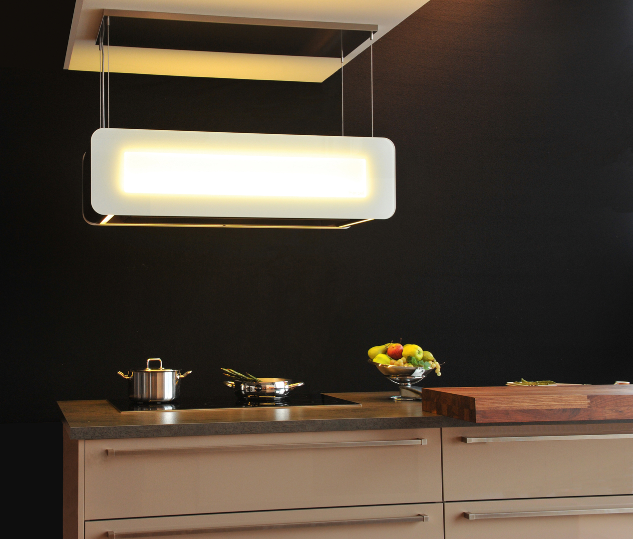 Whereas conventional extractor hoods use filters, the Skyline re-circulating air fan, created by designer Stefan Ambrozus for Berbel Ablufttechnik, features an energy-efficient centrifuge to capture and filter out grease. The Skyline extractor hood makes excellent use of this technical innovation and is also adjustable to individual user needs. The Skyline floats above the cooking field almost like a lift or a UFO, and thanks to energy-efficient LED technology provides optimum illumination for pure cooking joy. This lighting object is thoroughly convincing, because the Skyline perfectly merges technical function, ecological awareness and design quality into a sculpture of light.