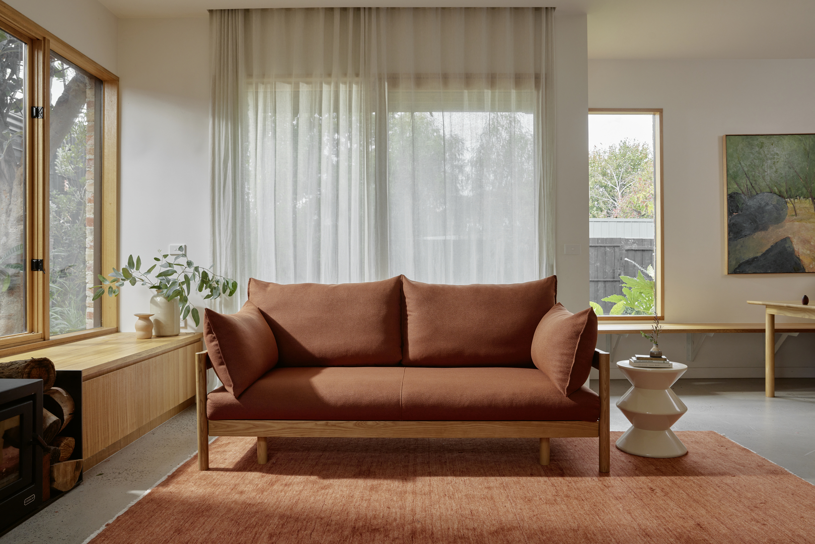 The Slideaway Sofa Bed can be assembled without tools and effortlessly transformed from a comfortable sofa into daybed or double bed. Thanks to the sophisticated construction of the slatted base, a comfortable lying surface can be achieved despite the compact form. The high-quality materials promise a long lifespan and have been selected for their sustainability. Accordingly, the cushions are filled with Oeko-Tex Standard 100 certified foam offcuts from mattress manufacturing, and their covers are washable.