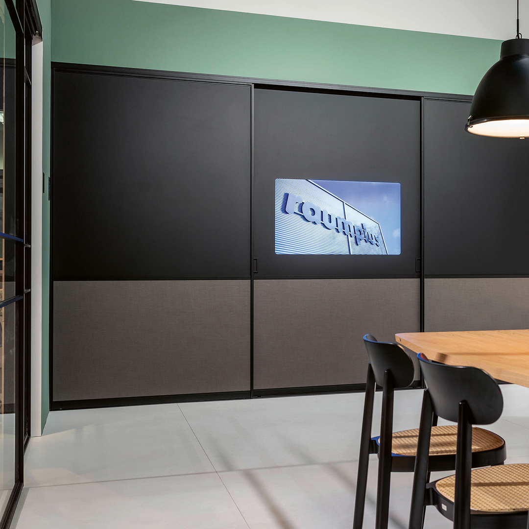 This product brings a sliding door and a media centre together, thus elegantly combining interior design with entertainment. This is made possible by integrating a 55" flat screen with a maximum weight of 25 kg into the door panel. The TV is then easy to operate using a Bluetooth remote control. Users can select door panels from a wide range of different colours and materials and so ensure they harmoniously match the interior. The same applies to the door system’s profiles which are also available in a wide selection of models.