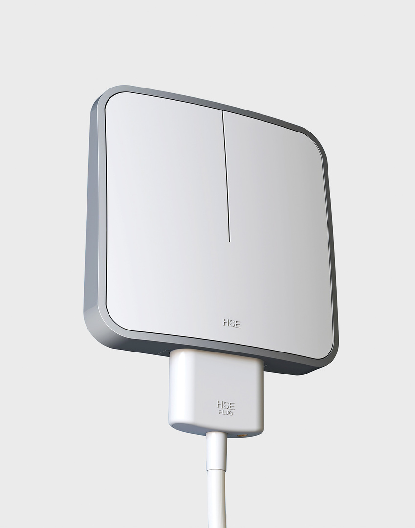 Typically, wall switches and power outlets are independent components. In this wiring concept, they are merged into a single, minimalist product. The front-facing switch is a ‘SMD Tactical Push Button’ and the power socket outlet is linked from the bottom.The technical design of the switch is based on an electrical circuit board that contains a solid- state-relay (SSR) to control alternating current power on/off and a tactile switch to govern the SSR open/close circuit. The socket can house either a USB or an Ethernet connector. The USB outlet uses a standard main switch PCB with an additional mobile charger board, but it also accepts regular female USB connectors. The Ethernet outlet uses a simple network circuit that accommodates more than one RJ connector, and LED light indicators confirm data transfer.