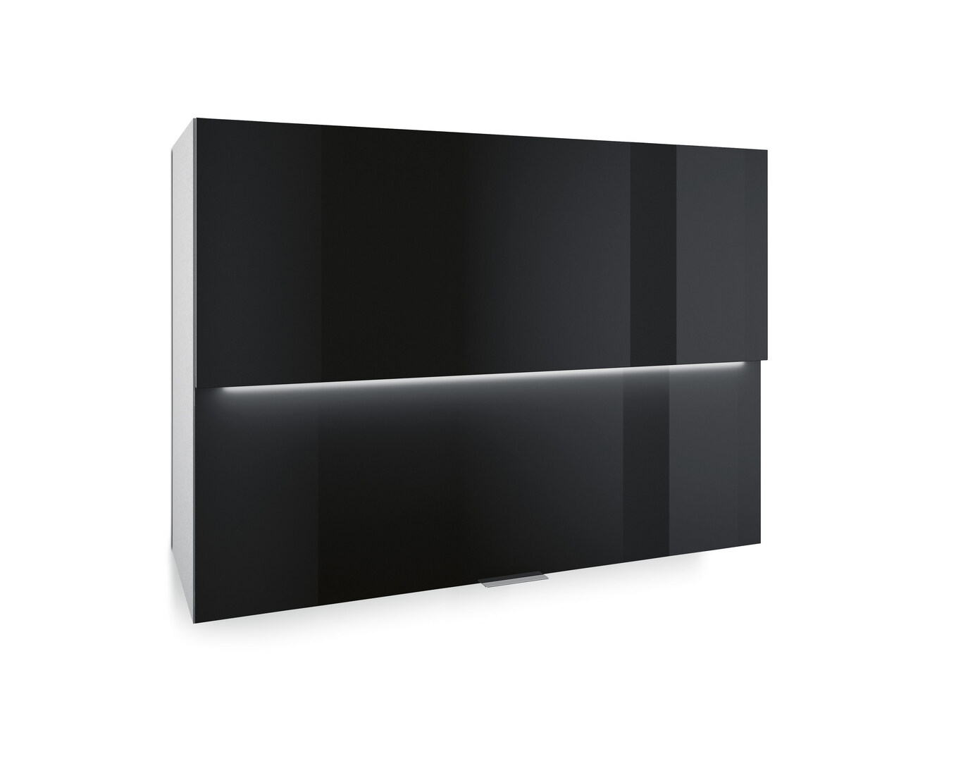 The new SlightLift system is an upper wall-mounted unit and shelf in one. To open it, the lower front is first slid vertically behind the upper one so that the unit is half open. An LED light band at the underside of the upper front illuminates the now visible cupboard. To open the cupboard fully, both fronts are swung upwards. The light at the lower side switches off automatically, and the light inside the cupboard is activated.