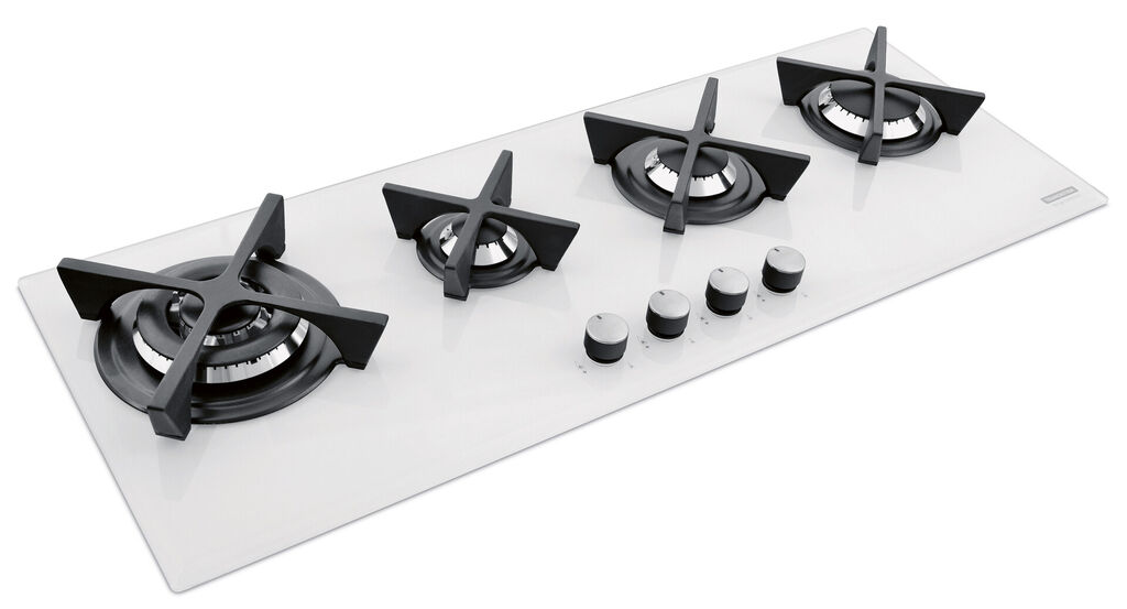 Slim Glass Flat 4GG 100 is a gas hob which is especially ergonomic in design due to the horizontal arrangement of its four powerful burners. The surface of the cooking zone consists of white, hardened glass, making it very hard-wearing, at the same time giving it an elegant impression. In exciting contrast to it are four, cast-iron trivets and the matt enamelled discs and burner caps.