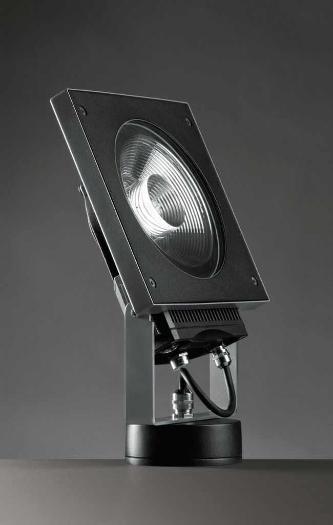 Slopia is a waterproof spotlight, with IP 65 protection, for both interior and exterior use. Thanks to a double reflector system incorporated in the die-cast aluminium casing the spotlight is very thin. This is further accentuated by the square, panel-shaped front frame. The optional high-gloss reflectors, providing either symmetrical or asymmetrical light distribution, easily mask out the high-efficiency HIT lamps. A membrane valve prevents the formation of condensation.