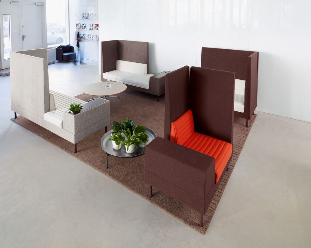 Smallroom consists of just a few elements, but offers many possibilities for variation and can be used in different combinations or as a single module. The “box” on the side is characteristic of the sofa. It can provide a place for plants, electric sockets or serve as a storage area. The back of the sofa can be perceived as a protective screen. Smallroom can be modified with backs and sides of varying heights, which thereby make it possible to create different environments.
