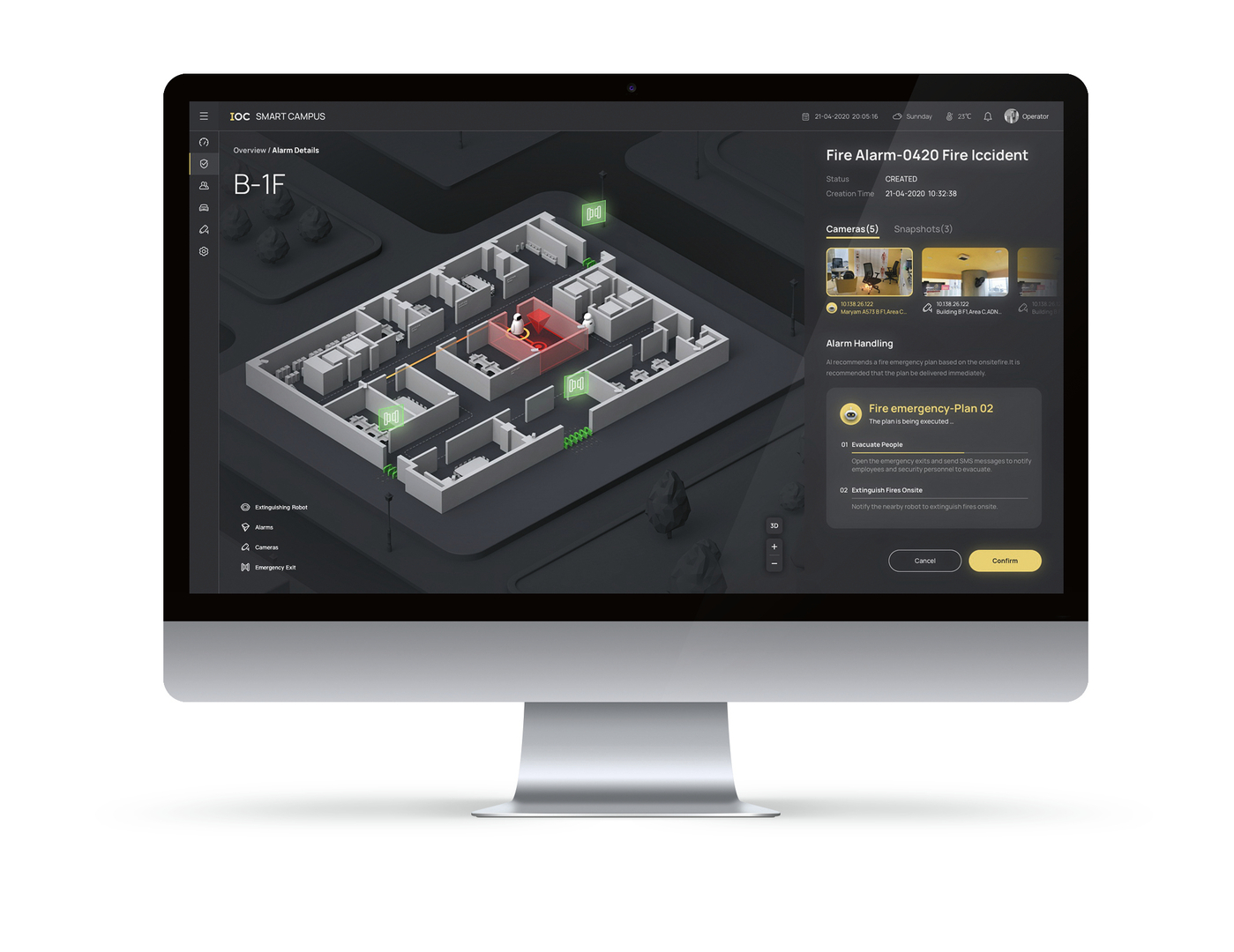 The Huawei Smart Campus AI system is designed for campus management services. It monitors the internal operational status in real time and can detect when a fire breaks out on campus. It triggers the warning system, analyses the on-site fire situation and implements an emergency plan. The user interface displays the campus three dimensionally and highlights the danger zone in colour, so that the response team can obtain information quickly and comprehensively before taking action. This reduces the danger for potential fire victims as well as firefighters.