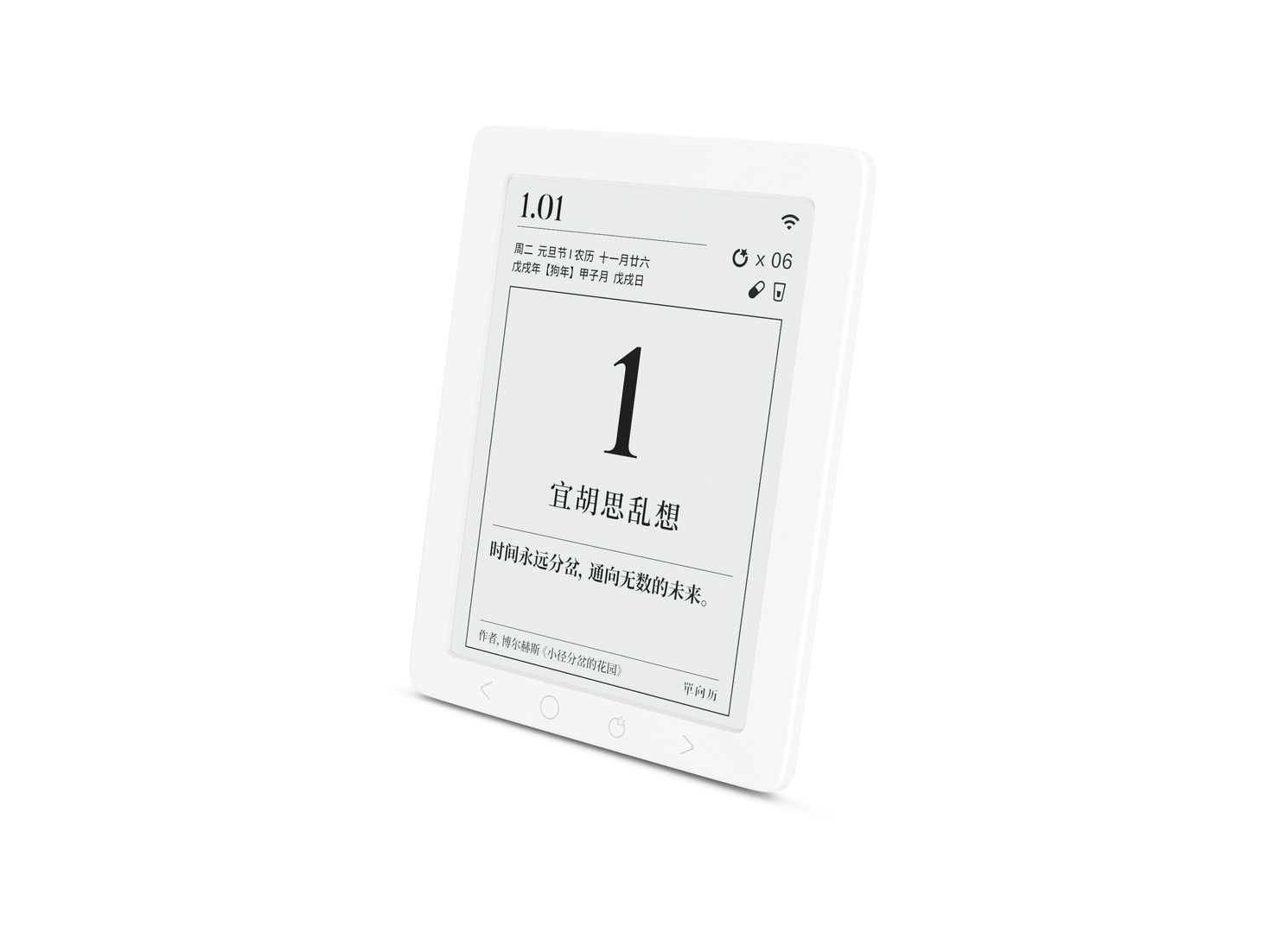 This intelligent e-calendar is connected to an app that can switch between multiple calendar channels, which can be defined by any organisation or individuals. It also provides a weather feature, as well as a reminder function. As for health issues, for instance, it can remind the user to drink water or take medication. The integrated electronic-ink display with a viewing angle of up to 178 degrees and an e-ink display make the calendar clearly visible from every corner of the room. Its simple design made from organic materials makes a good impression.