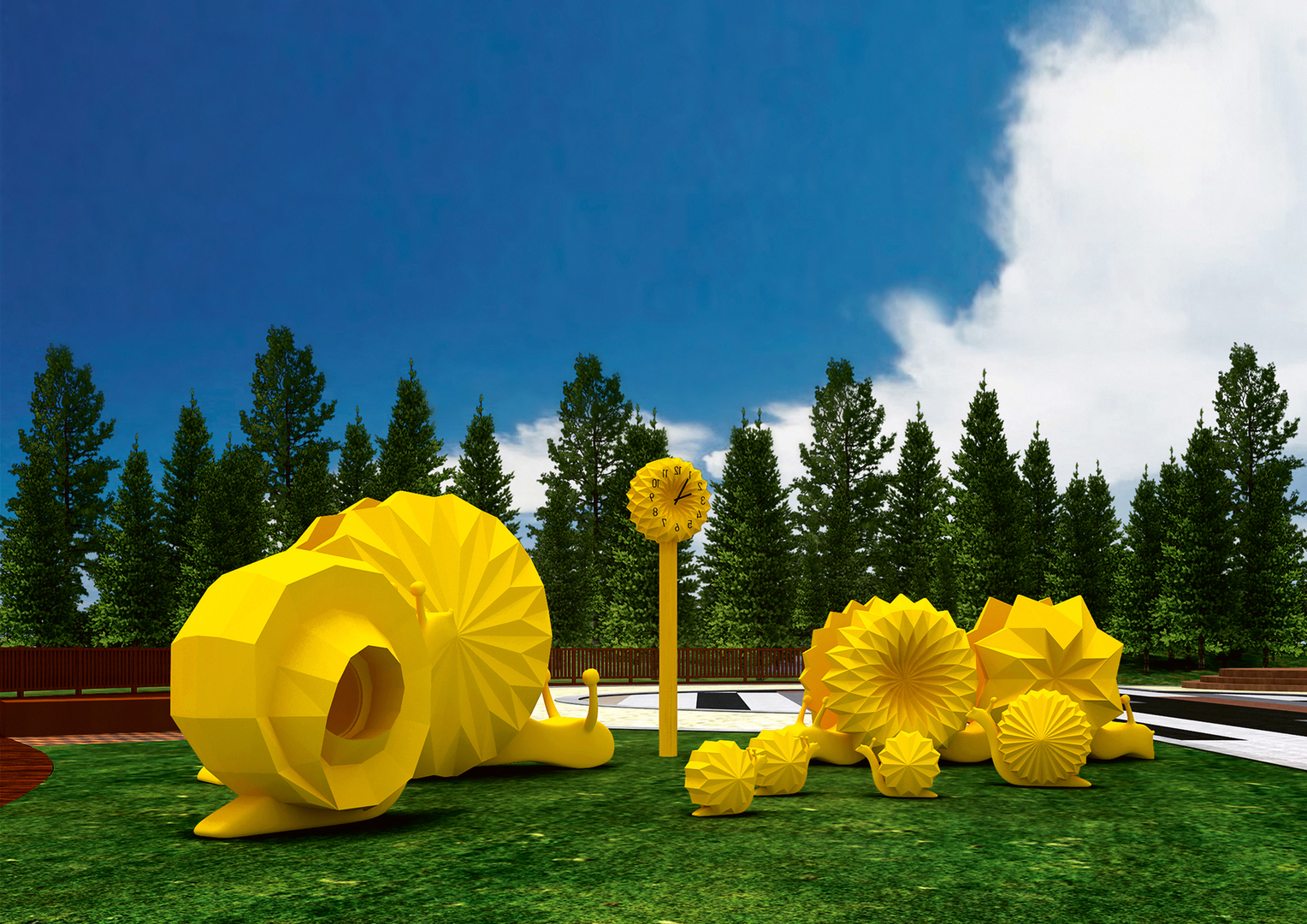 The challenge in designing the Snail Garden outdoor amusement facility located on the top of a hill was that the surroundings of the place were not child-friendly. The project proposes a new form of urban playground that is suitable for the hills and valleys of Busan, South Korea. The subtitle “Peak-nic” (Peak + picnic) denotes a picnic in the mountains. The snail series was inspired by origami and designed with a functional purpose. The six different sculpture-like items are suitable for both children and families, functioning as playground slides, climbing structures, exiting holes or benches.
