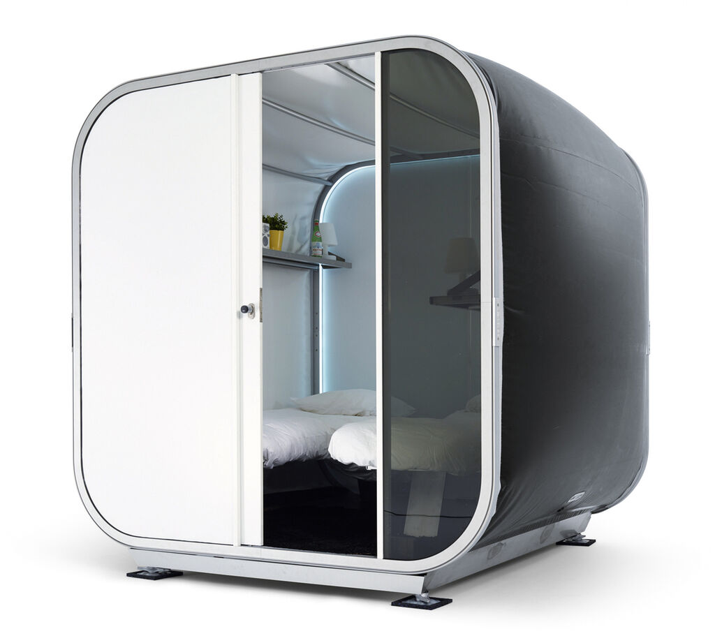 Snoozy is a flat-packed portable sleeping unit for two, which can be set up and used virtually anywhere. Capable of being assembled in just a few minutes, it is suitable for short-term events, permanent installations or an emergency situation. It has a bespoke lightweight frame system made out of extruded aluminium designed to allow easy integration of all structural elements to work together seamlessly. The main exterior is wrapped in a sealed air-inflated skin made from heavy-duty flexible fabric.