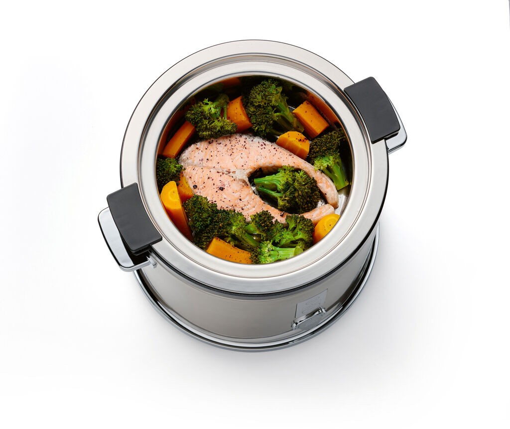 The Solis Rice Cooker Multi is a compact 1.2-litre rice cooker with an additional steam cooking function, ideal for preparing fish or vegetables. The housing is made of brushed, fingerprint-resistant stainless steel. A glass lid allows you to monitor the cooking process without losing heat. Functions for reheating and keeping warm can be accessed via the clearly structured control panel. The non-stick, PFAS-free insert makes cleaning easy, and the stainless steel steam tray has heat-insulated handles.