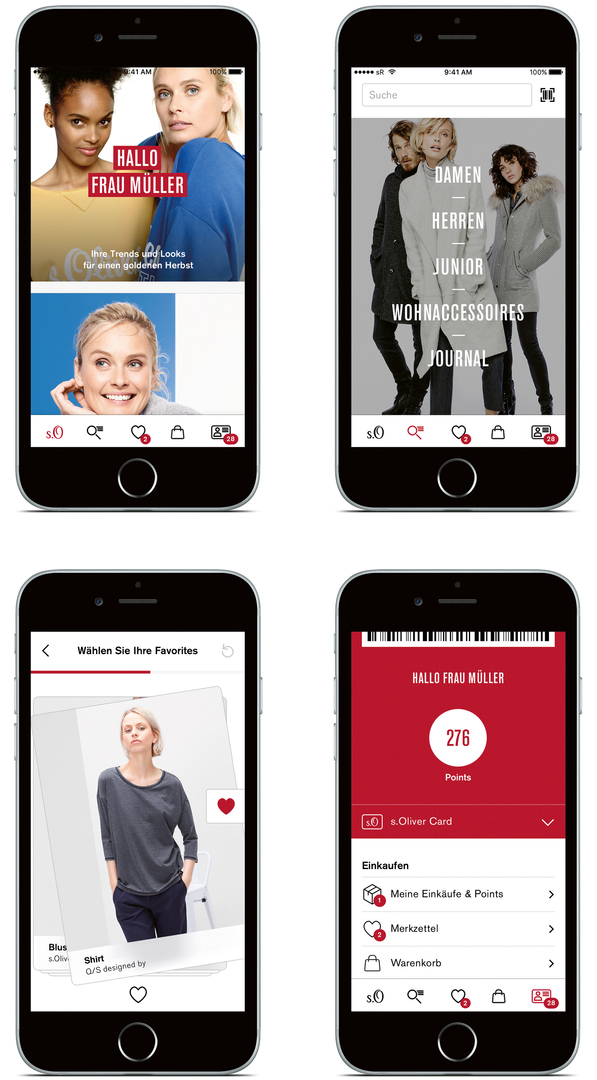 The s.Oliver Fashion App is a personal shopping assistant that accompanies customers in a very personalised way. Playful elements turn shopping into a holistic and fun experience. Users are presented with product suggestions using an intuitive swipe method and can create their own style profiles. The start page is customised based on user data such as size, gender and preferred fashion styles. It features suitable collections and inspirations as well as targeted individual suggestions. Moreover, the app incorporates all advantages of the s.Oliver Card, enabling these benefits to be applied at any time.
