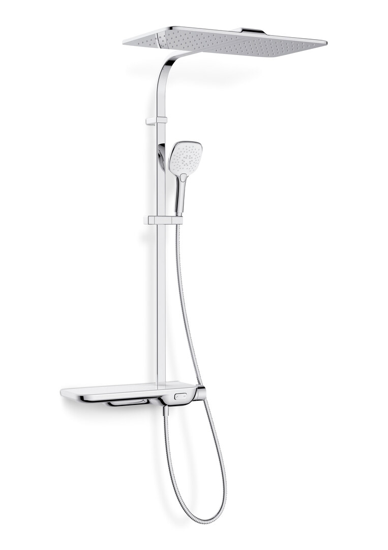 The stainless steel Solux shower system is designed to lend the head shower stability through its mounting, providing users with a considerably larger showering area. Furthermore, the mixer is intuitive to understand and operated by one hand, guaranteeing even more comfort. The water temperature can be controlled and set to a constant 39 degrees Celsius. The selector switch on the front of the shelf area allows a simple choice of spray form.