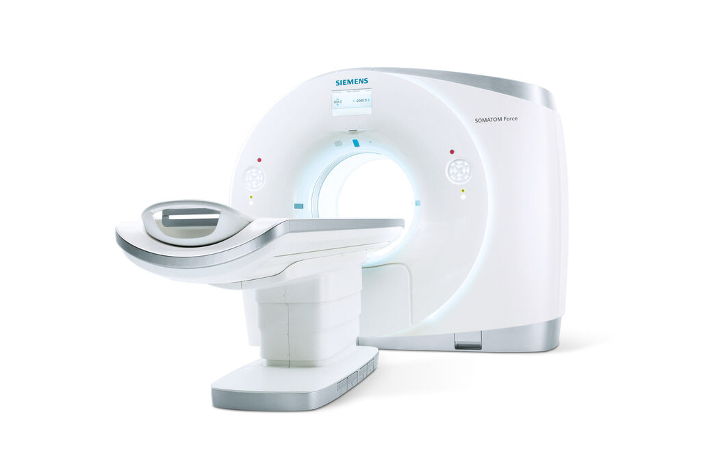 Somatom Force is a computed tomograph that is equipped with two radiation tubes and two detector systems, allowing it to produce images at a particularly high speed. Its newly developed X-ray tubes reduce the radiation burden of patients undergoing the examination. The opening of the high-end device can be lit in any desired colour, thus helping the patient to relax.