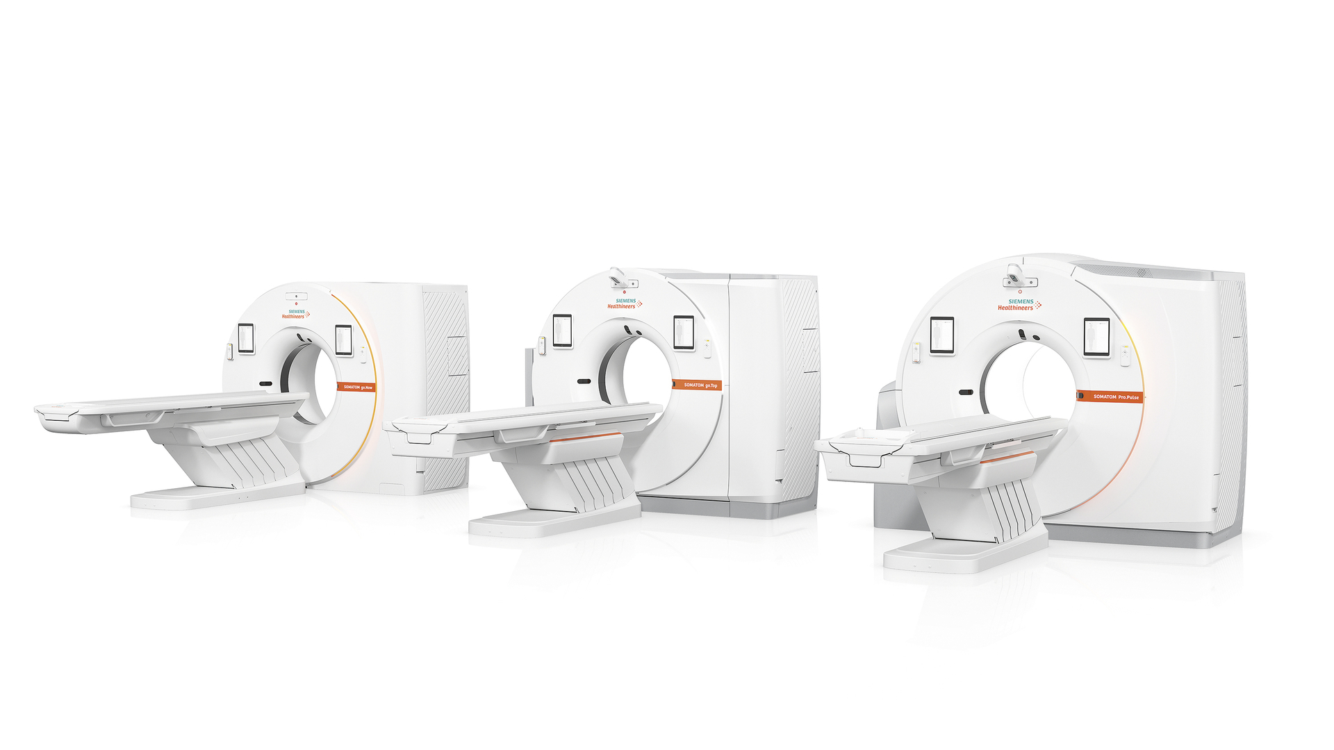 The SOMATOM go. Family comprises advanced CT devices designed according to the Core & Shell principle to visually structure each system into human touch points and technical areas. Differentiation within the family is defined by the ratio of design details, size, colour and dynamic accentuation of characteristic surface treatment. By reducing complexity and decorative elements, a consistent and clear appearance is achieved. New to the family is the high-end system SOMATOM Pro.Pulse.