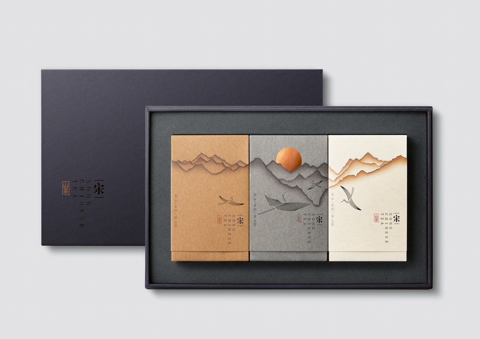 This tea packaging has been created for a brand based on culture from the Chinese Song Dynasty. In order to artistically convey the notions of high mountains and the charcoal-baking processing of the tea, three different designs and colours have been selected. They each visualise a different tea concentration, while the images can be connected and combined. The burned mark design of the packaging has been scanned from the real firing mark and then embossed using laser engraving so as to represent the layer upon layer appearance of mountains. At the same time, it also reflects the texture of traditional Chinese ink painting.